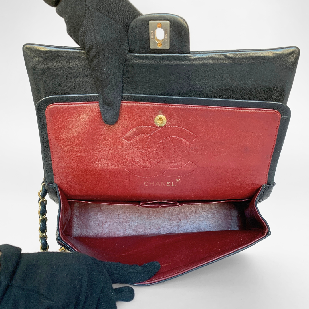 Chanel Classic Flap Bag in a size Medium in black Lambskin Leather. The Chanel Classic Double Flap is one of the most iconic handbags ever created and has been regarded for decades as a symbol of timeless style and elegance. The name “Double Flap” refers to the ingenious design of the bag, where there is an extra flap on the front that covers the zipper. The bag is made of high-quality leather and has a distinctive quilting technique that gives it a luxurious look. The bag's hardware is gold-plated with 24K gold, which is very rare as this is no longer produced this way.