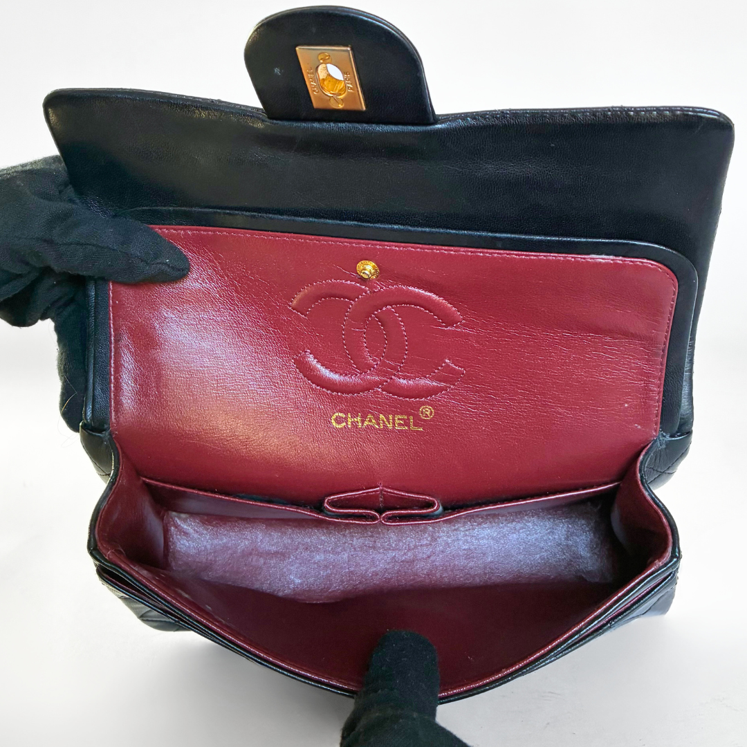 Chanel Classic Flap Bag in a size Small in black Lambskin Leather. The Chanel Classic Double Flap is one of the most iconic handbags ever created and has been regarded for decades as a symbol of timeless style and elegance. The name “Double Flap” refers to the ingenious design of the bag, where there is an extra flap on the front that covers the zipper. The bag is made of high-quality leather and has a distinctive quilting technique that gives it a luxurious look. The hardware of the bag is gold-plated with 24K gold, which is very rare as this is no longer produced this way these days.