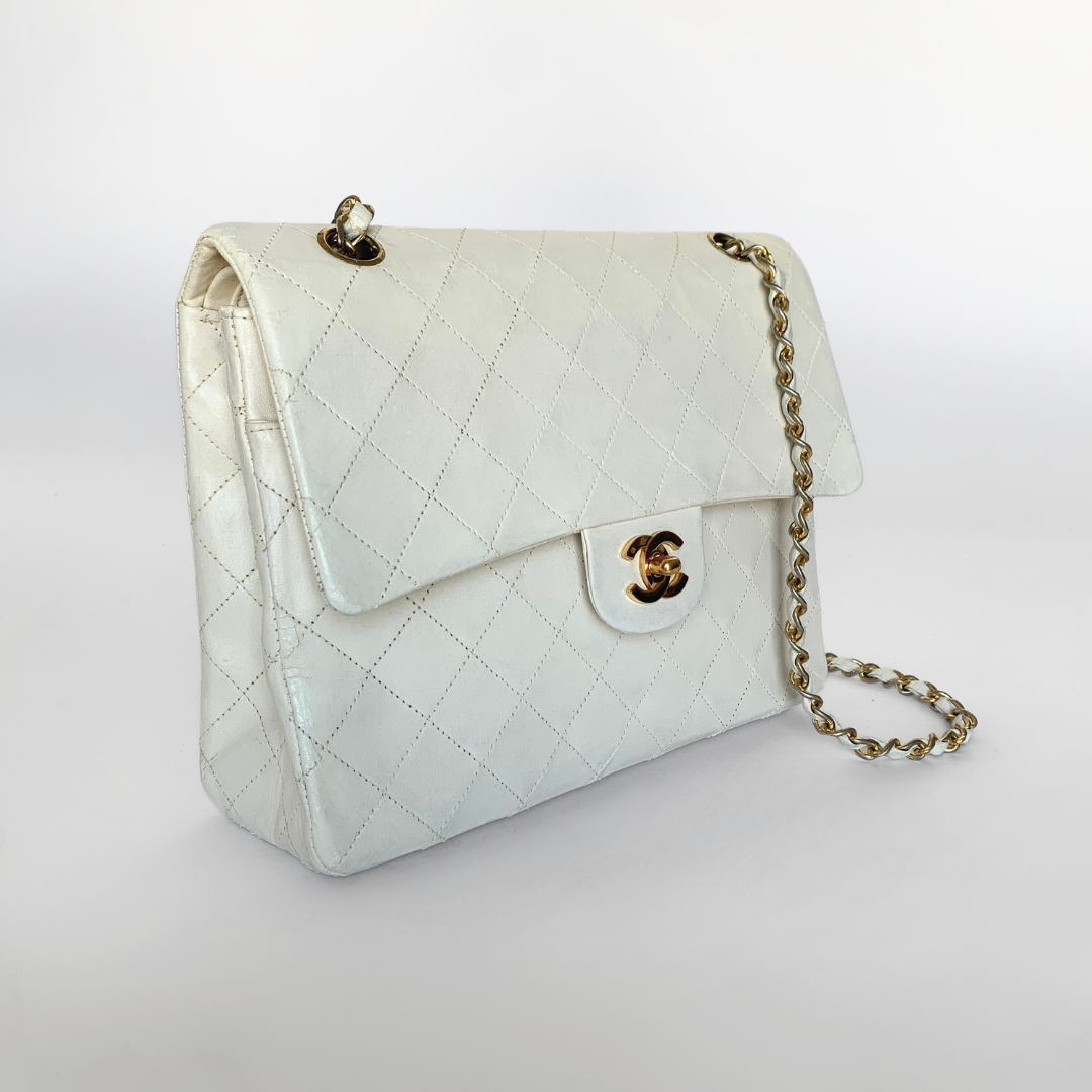Chanel Classic Flap Bag in a size Medium in white Lambskin Leather. The Chanel Classic Double Flap is one of the most iconic handbags ever created and has been regarded for decades as a symbol of timeless style and elegance. The name “Double Flap” refers to the ingenious design of the bag, where there is an extra flap on the front that covers the zipper. The bag is made of high-quality leather and has a distinctive quilting technique that gives it a luxurious look. The bag's hardware is gold-plated with 24K gold, which is very rare as this is no longer produced this way.