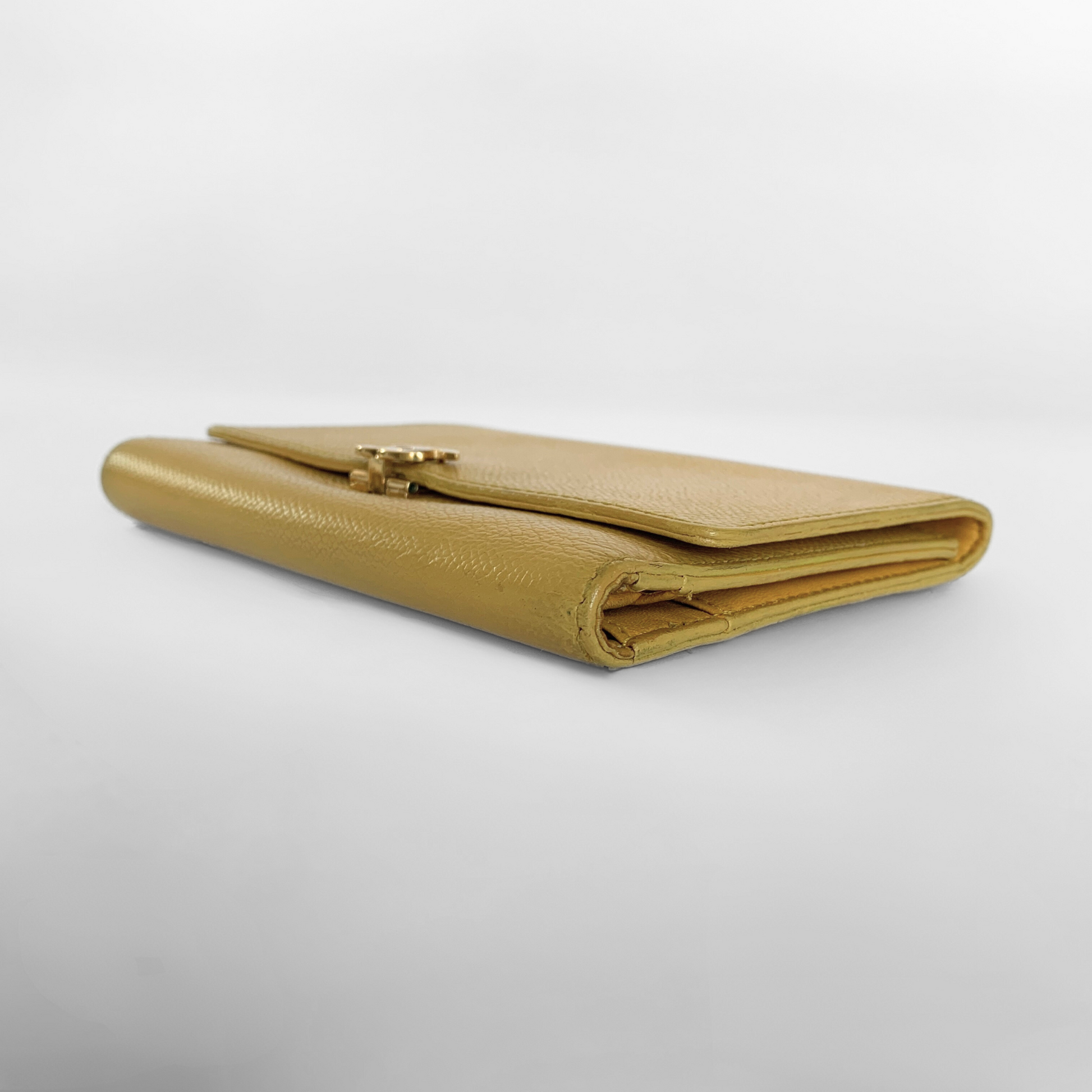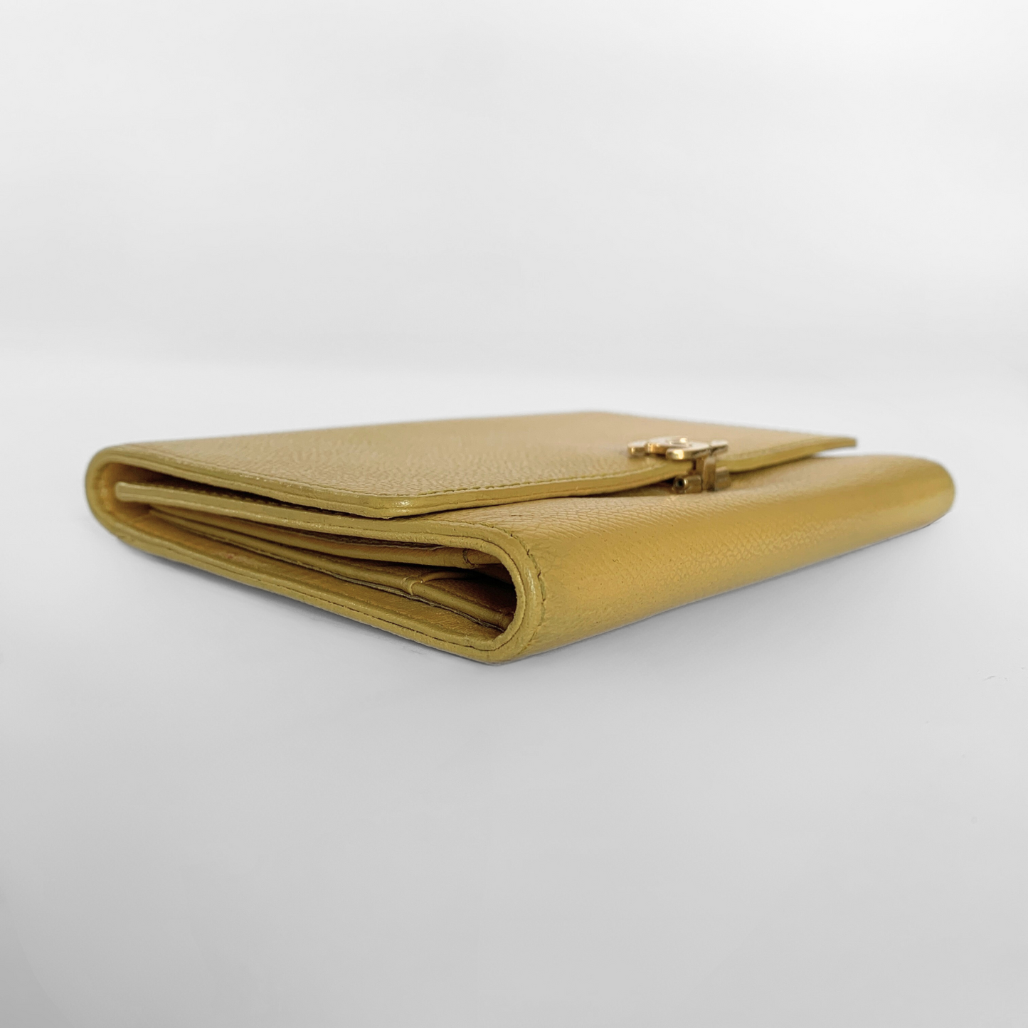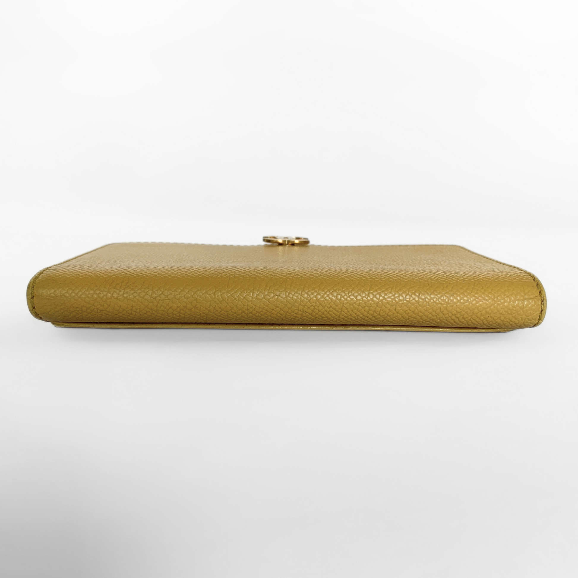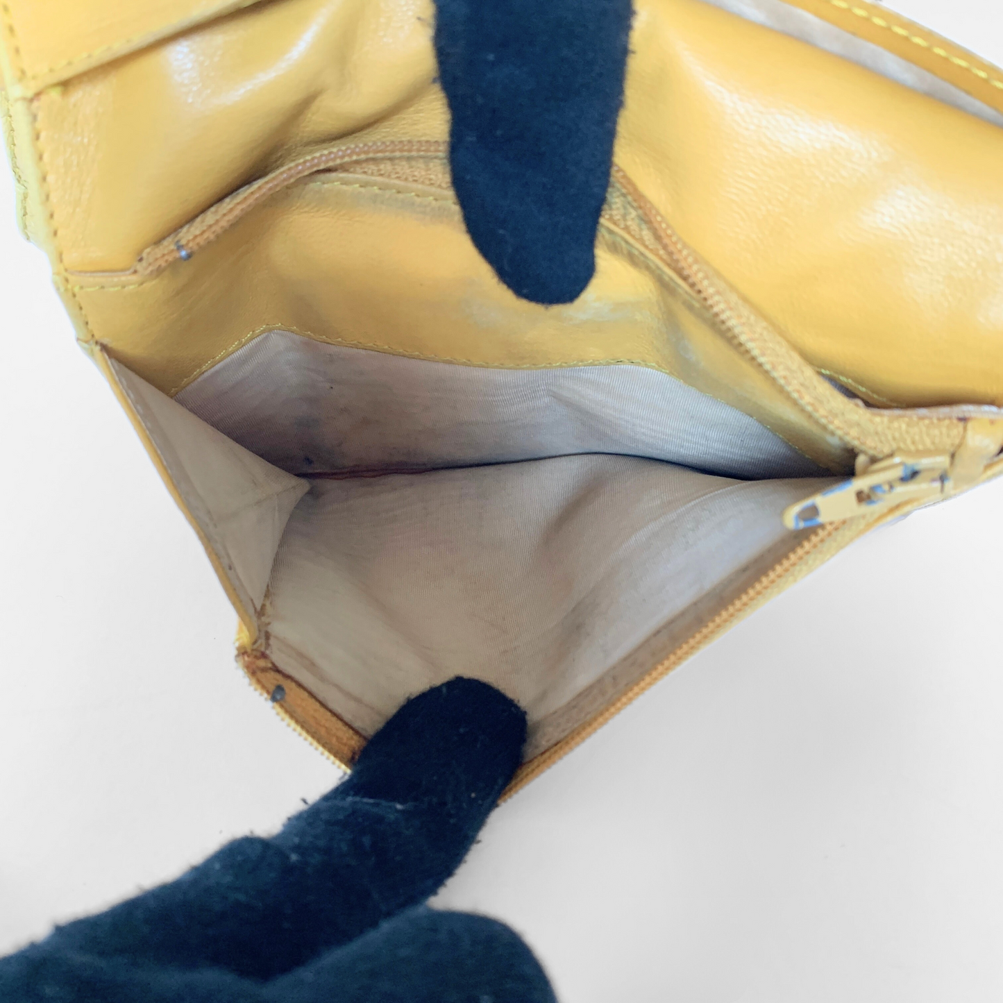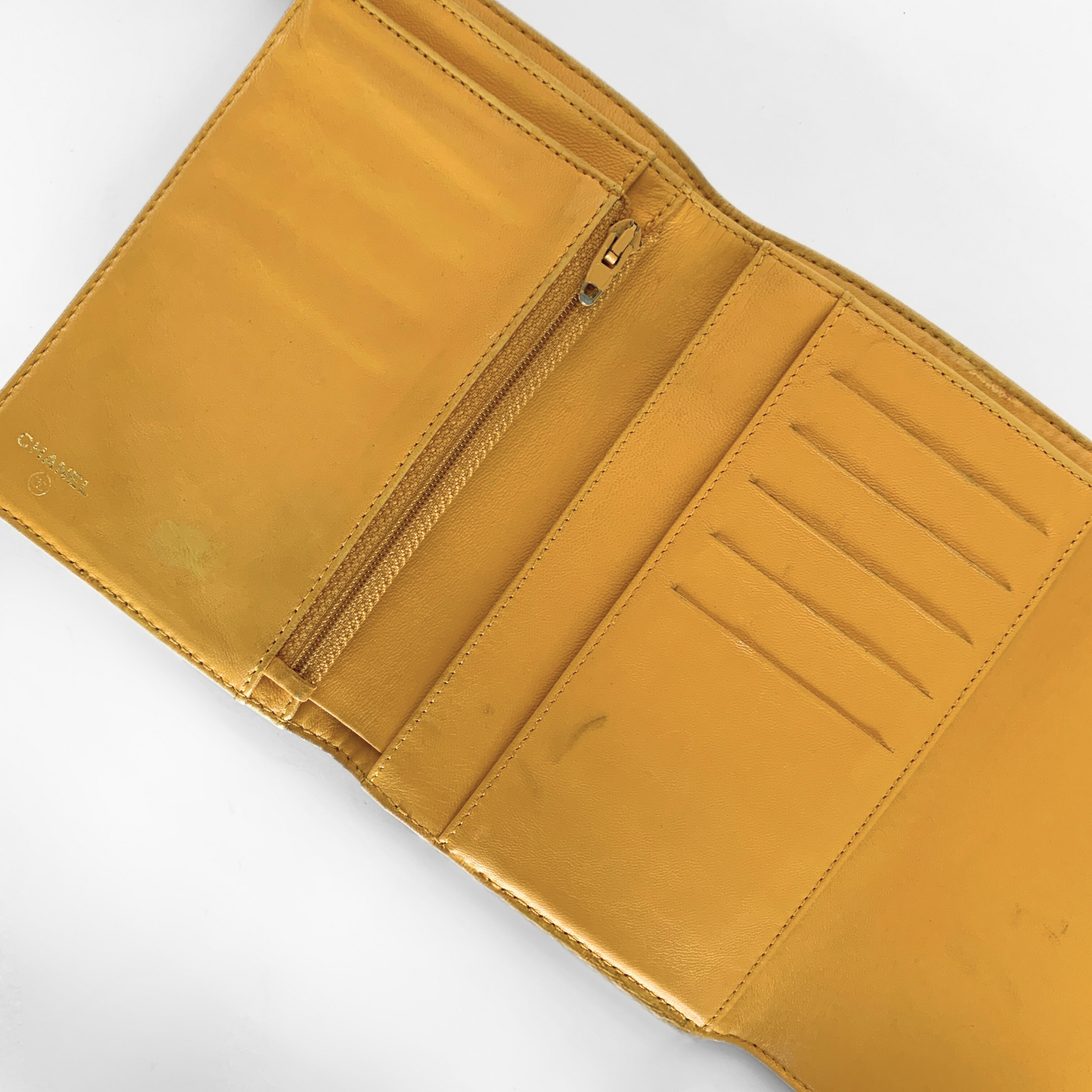 The wallet opens by pulling the CC logos, made of gold-colored hardware, to the back. The interior is also made of yellow leather and features five card holders, three slip-in pockets and a zipper pocket for coins. This wallet comes with the original Chanel box.