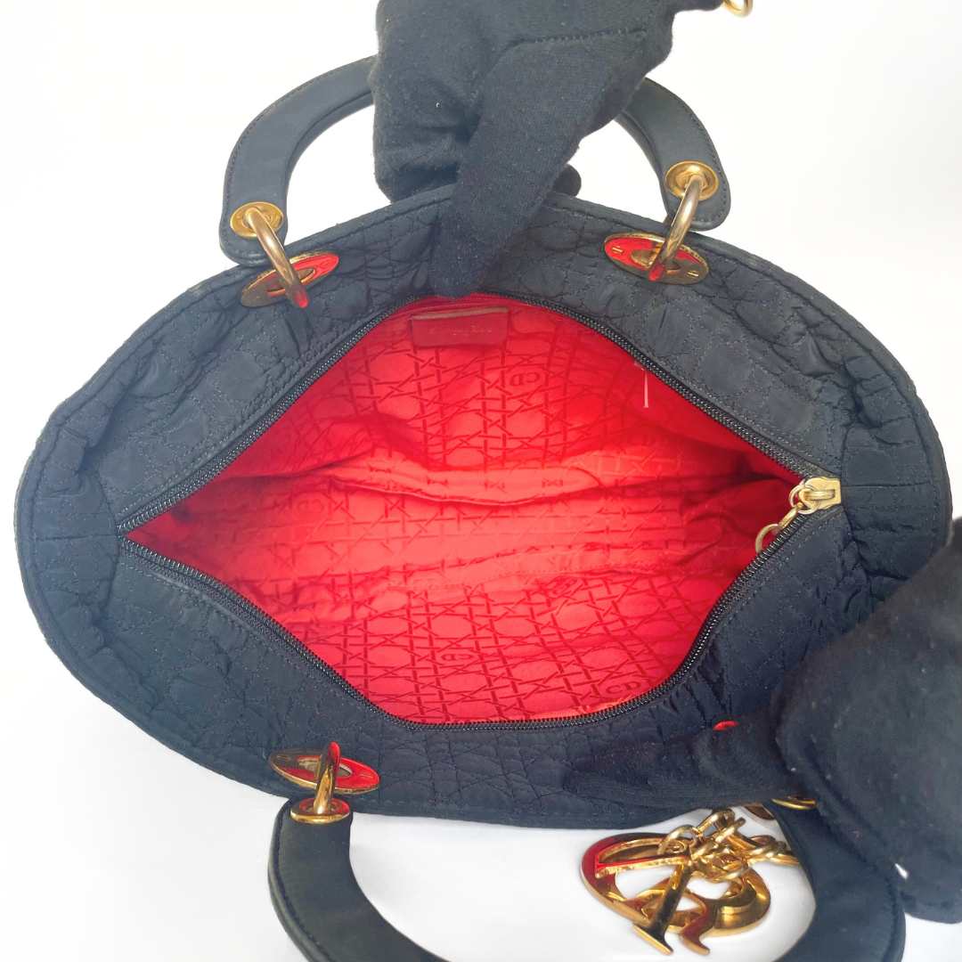 Dior Lady Dior GM in black Microfiber with gold-colored hardware. This Lady Dior Bag is an unmissable item in your statement wardrobe and goes with every outfit. The Lady Dior bag by Dior is as elegant as Lady Diana, the Princess of Wales after whom the bag is named. The Lady Dior was first launched in 1944 with no official name. In September 1995, a classic black-colored Lady Dior bag was given as a gift to Lady Diana. In 1996 it was renamed "Lady Dior "with her blessing.