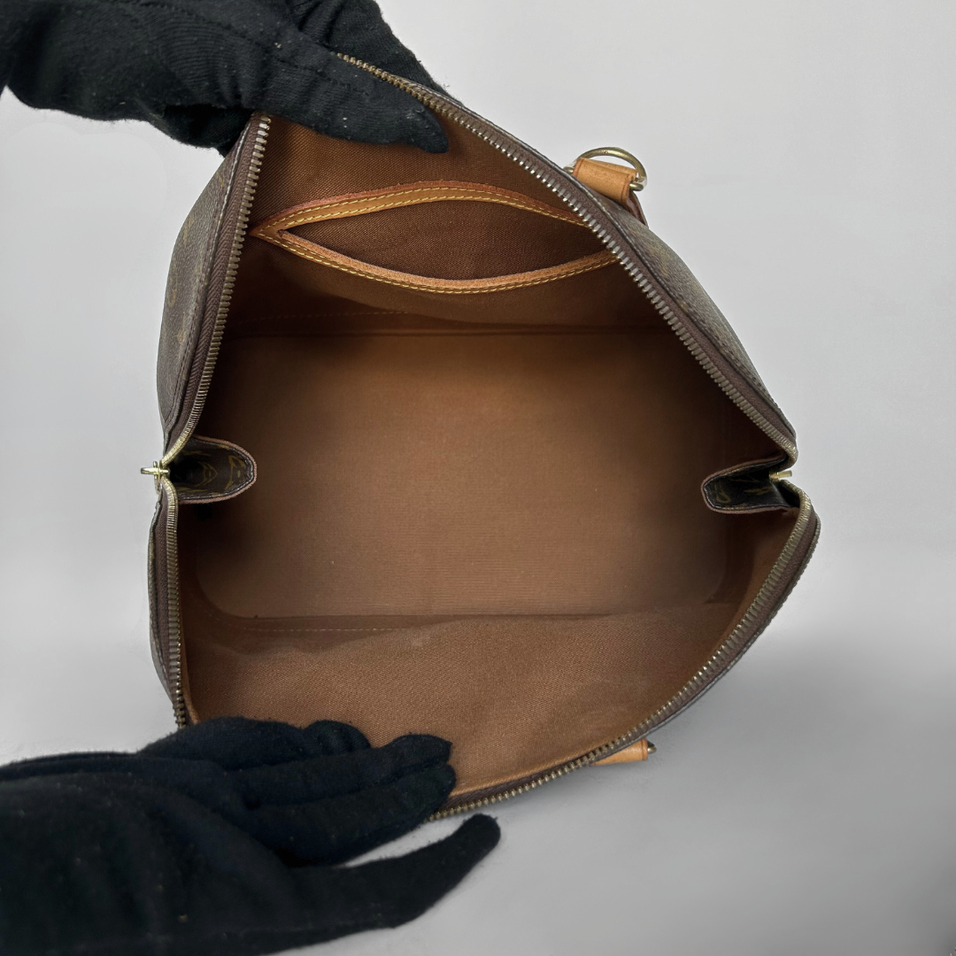 The bag has Vachetta Leather round “Toron” handles and trims, and gold-colored hardware. The handbag closes with a zipper that extends to the leather at the bottom of the bag. The inside is made of cotton Canvas and contains one small slip-in pocket, in which the date code is hidden. This timeless house icon is ideal for everyday use, worn by the hand or wrist.