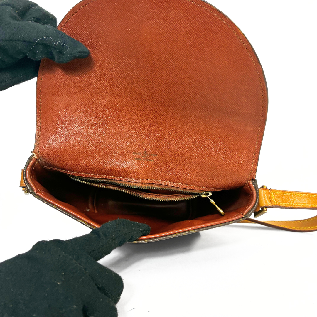 The overall condition of this vintage bag is good. The shoulder strap has been replaced with a new one that is not Louis Vuitton, but it is in good shape. The Vachetta leather and canvas are both in good condition. The Vachetta leather has become a bit dry and dark, but that is normal for vintage Louis Vuitton bags. The inside pocket in the bag is used and dirty.
