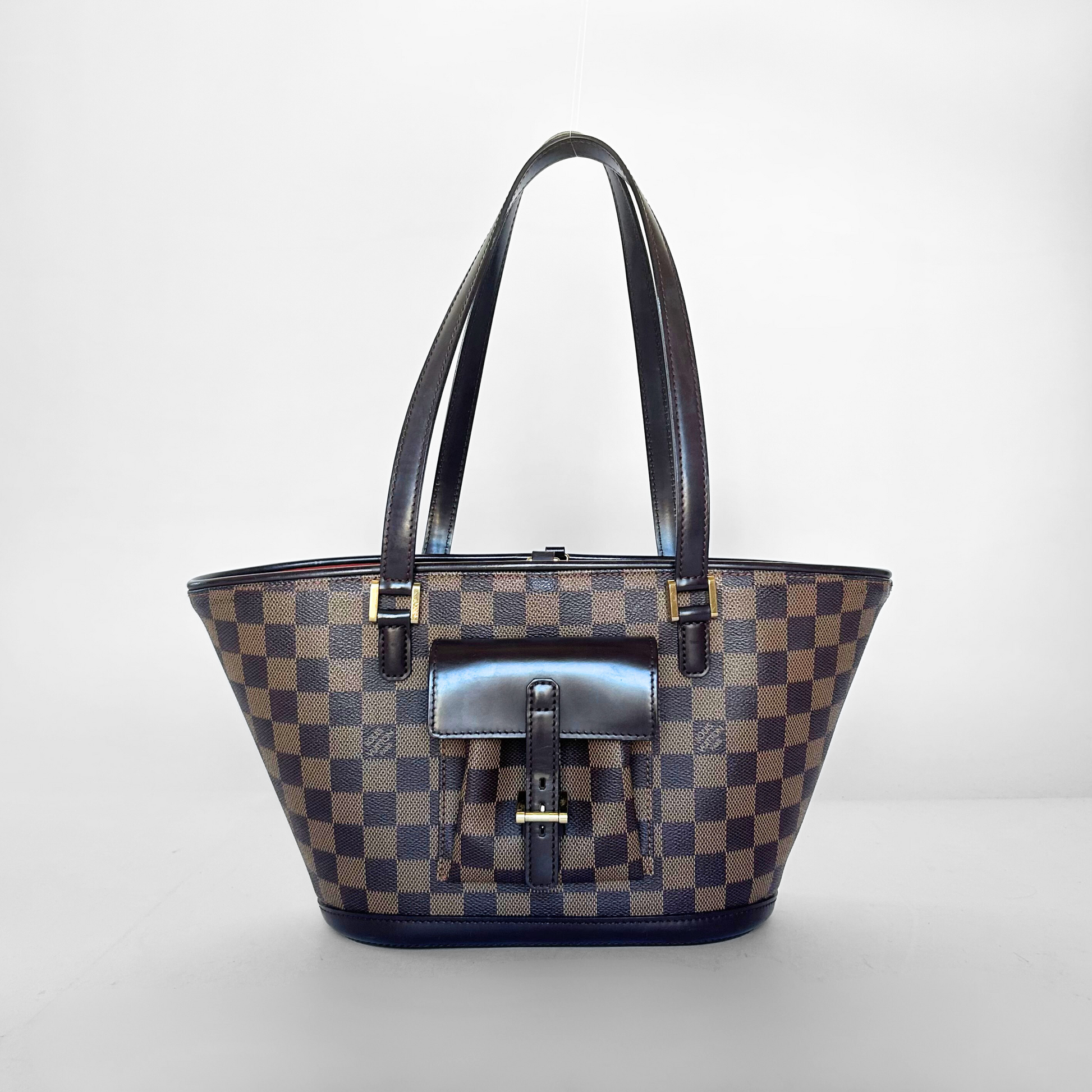 Louis Vuitton Manosque, size PM in Damier Ebene Canvas. The bag has coated Vachetta leather details and gold-colored hardware.