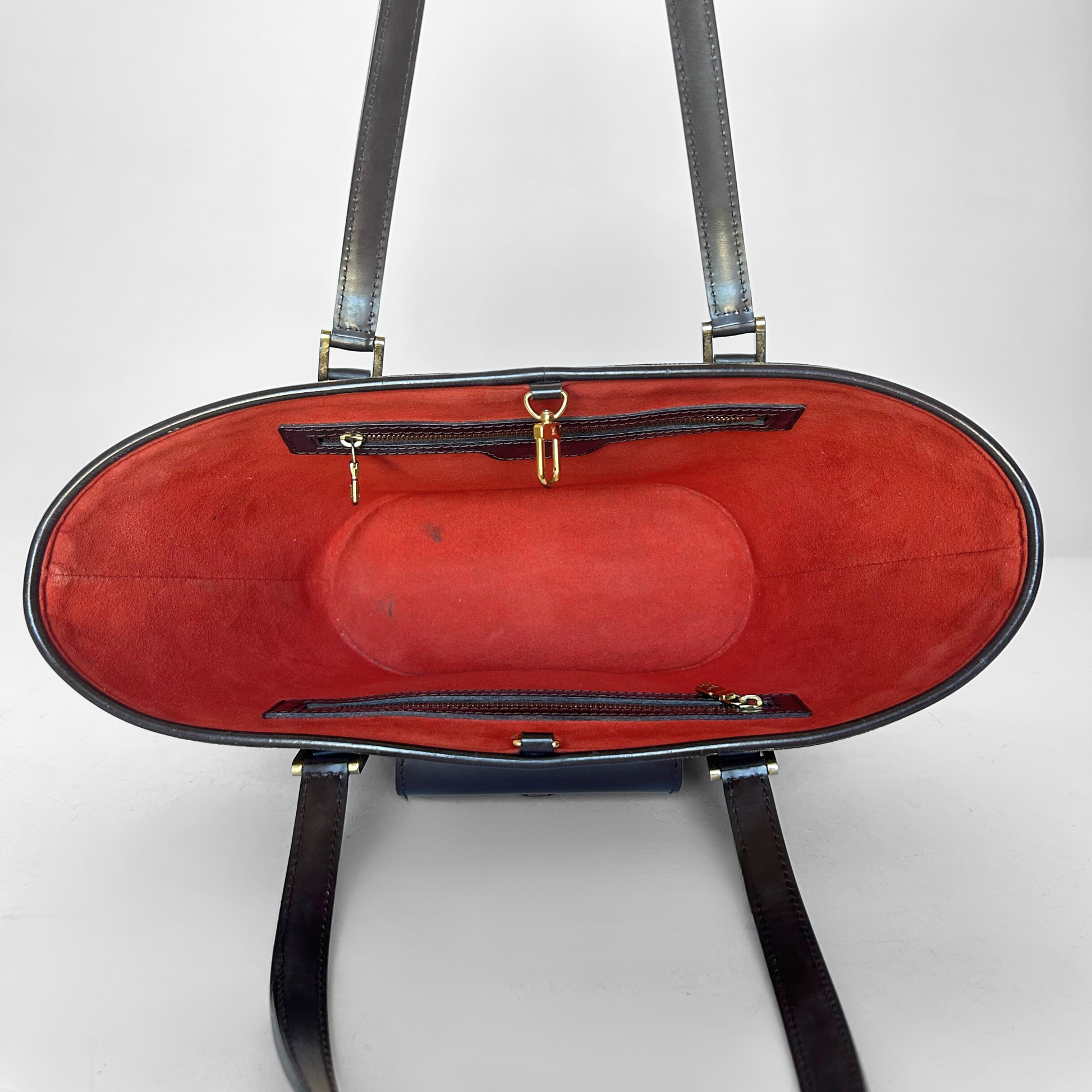 It can be closed with the Louis Vuitton D-ring. On the front of the bag are two compartments, lockable with a strap. The inside is made of red cotton material and features two zipper pockets. You can carry the bag by hand or on the shoulder.