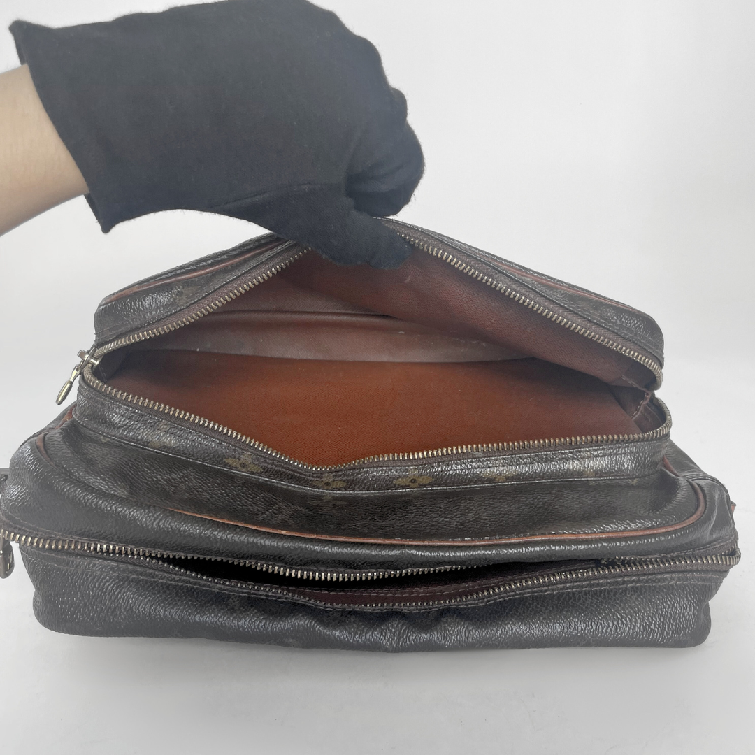 Louis Vuitton Nile in Monogram Canvas has an amazing shape which is ideal for everyday. It features a padded natural leather swiveling handle, and a zip top closure. It also features signature LV monogram canvas. A timeless Louis Vuitton bag. This crossbody bag allows you to carry all your essentials with hands free convenience.