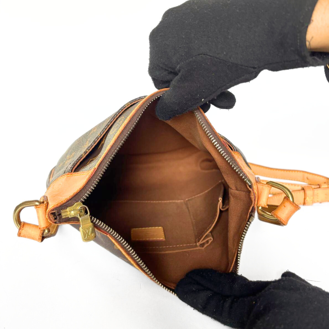 Louis Vuitton Odeon PM in Monogram Canvas and Vachetta leather. The bag closes with a zipper, has a big front pocket and features leather crossbody straps. The bag can be worn crossbody. The bag has gold-coloured hardware. The bag has two slip pockets on the inside. Its roomy interior, slouchy shape, combined with its timeless elegance makes the perfect everyday bag.