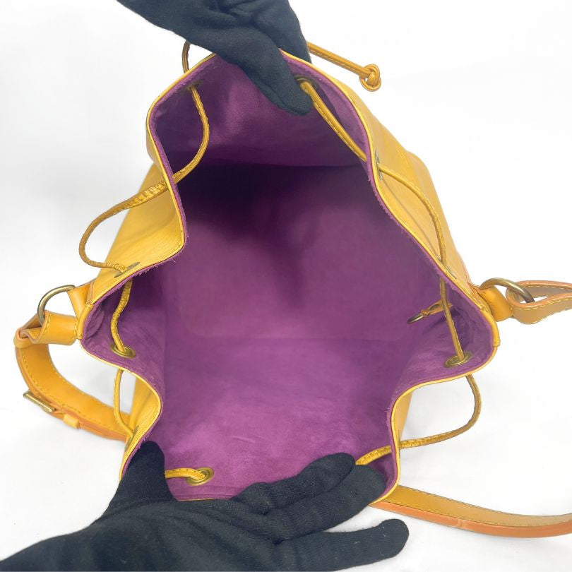 Louis Vuitton Petit Noé in Yellow Epi with a purple inside. Noé was created in 1932, along with other Louis Vuitton icons the Alma, the Keepall, and the Speedy. The Noé was designed to literally be a “bucket-shaped bag” which could carry four upright bottles of champagne and a fifth upside down in the centre. The drawstring would secure the bottles from rattling around.