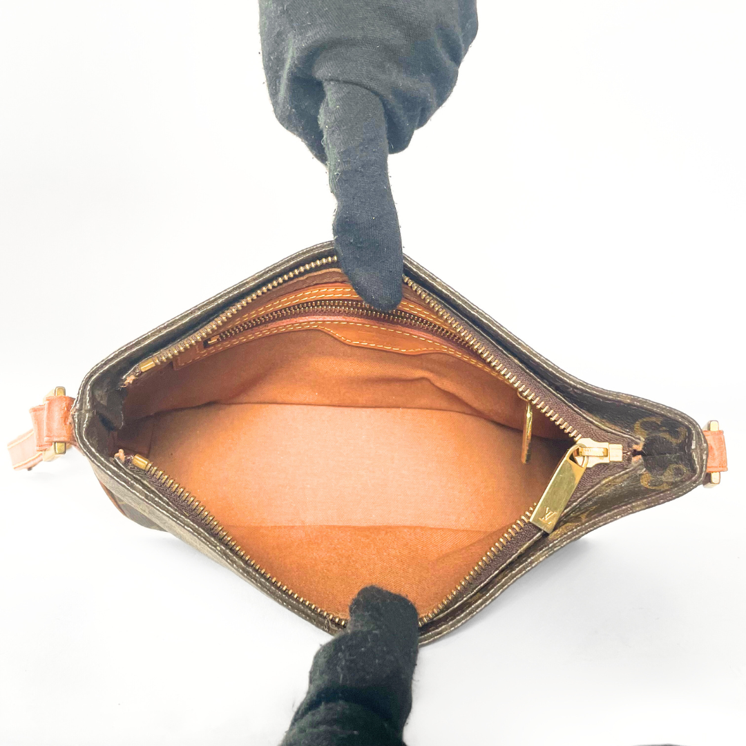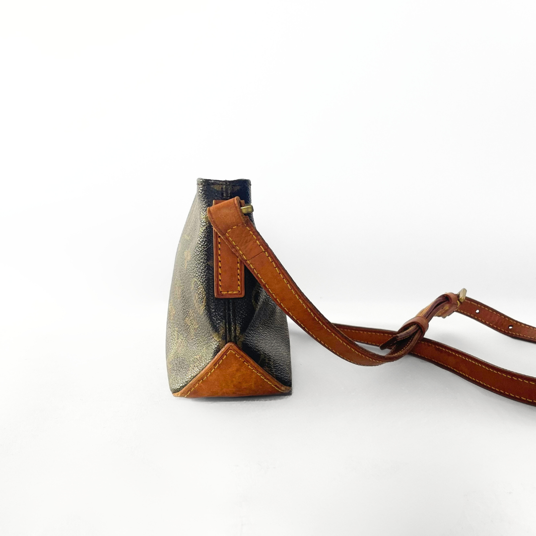 Louis Vuitton Trotteur in Monogram Canvas. The classic Monogram Canvas has been Louis Vuitton's trademark design since it was first introduced in 1896. The graphic symbols, including the quatrefoils and flowers, as well as the LV Monogram were used to prevent counterfeiting in the early days when it was first patented. Made of coated canvas, the Monogram's traditional look is also endured by its durability.